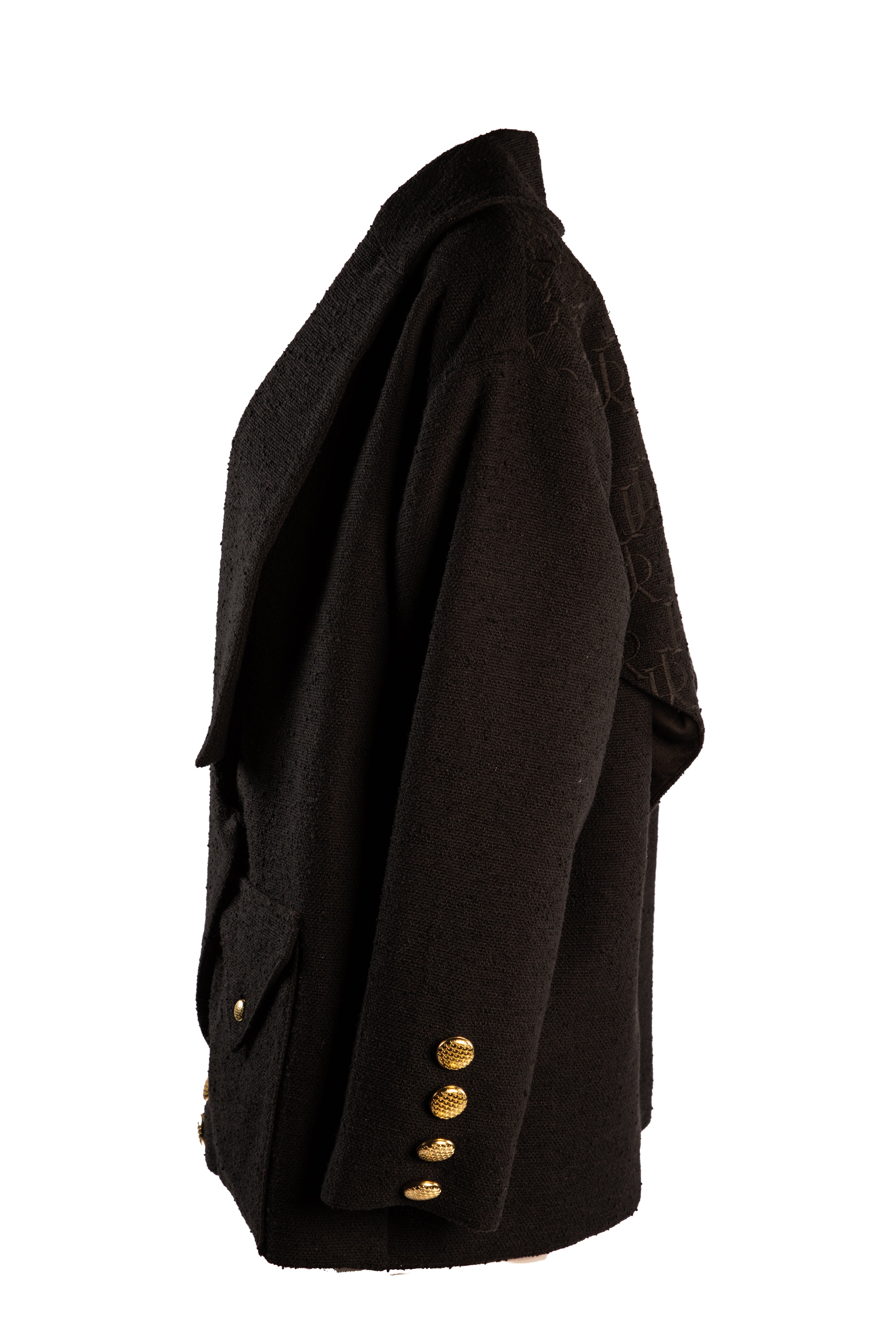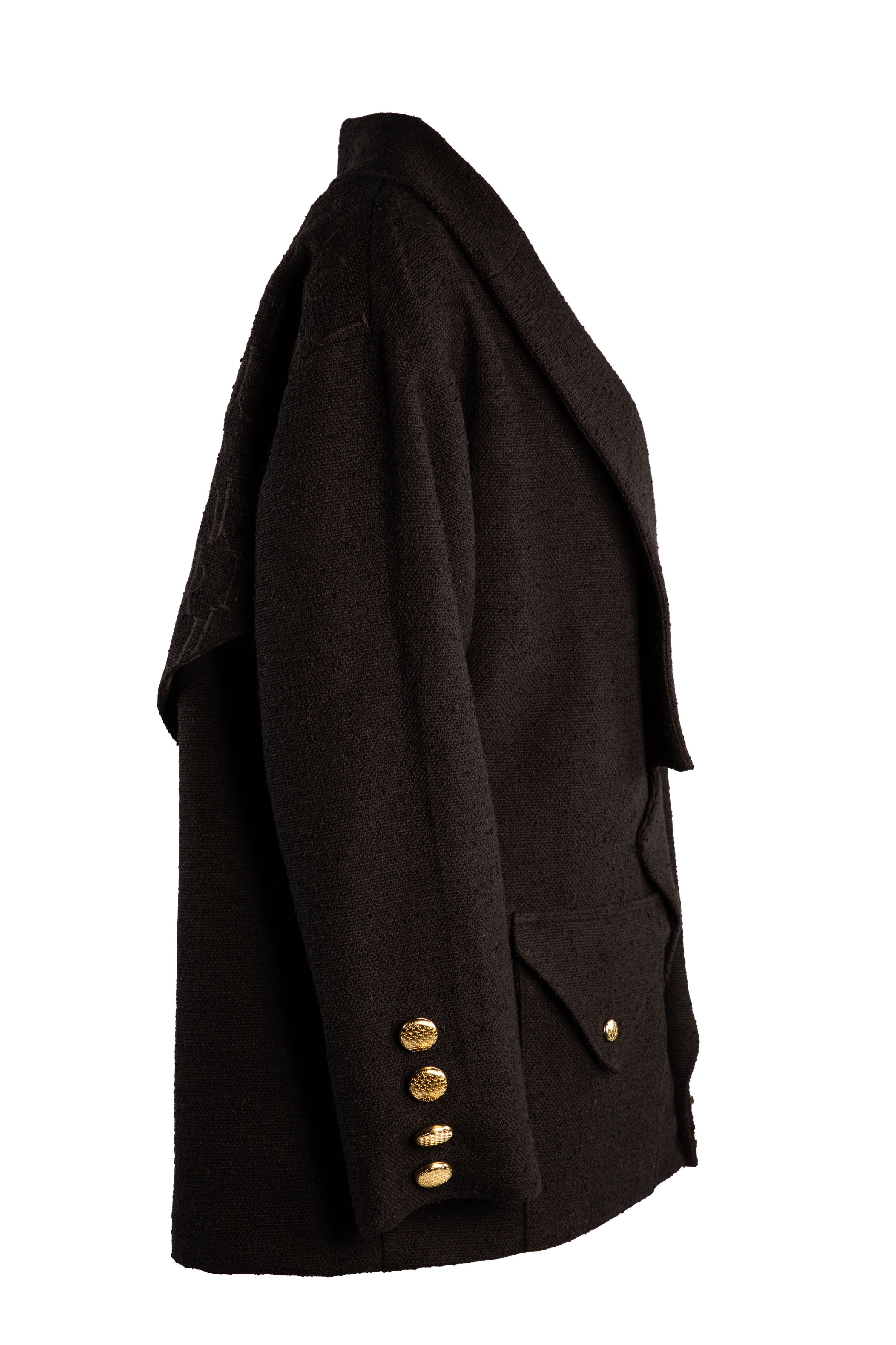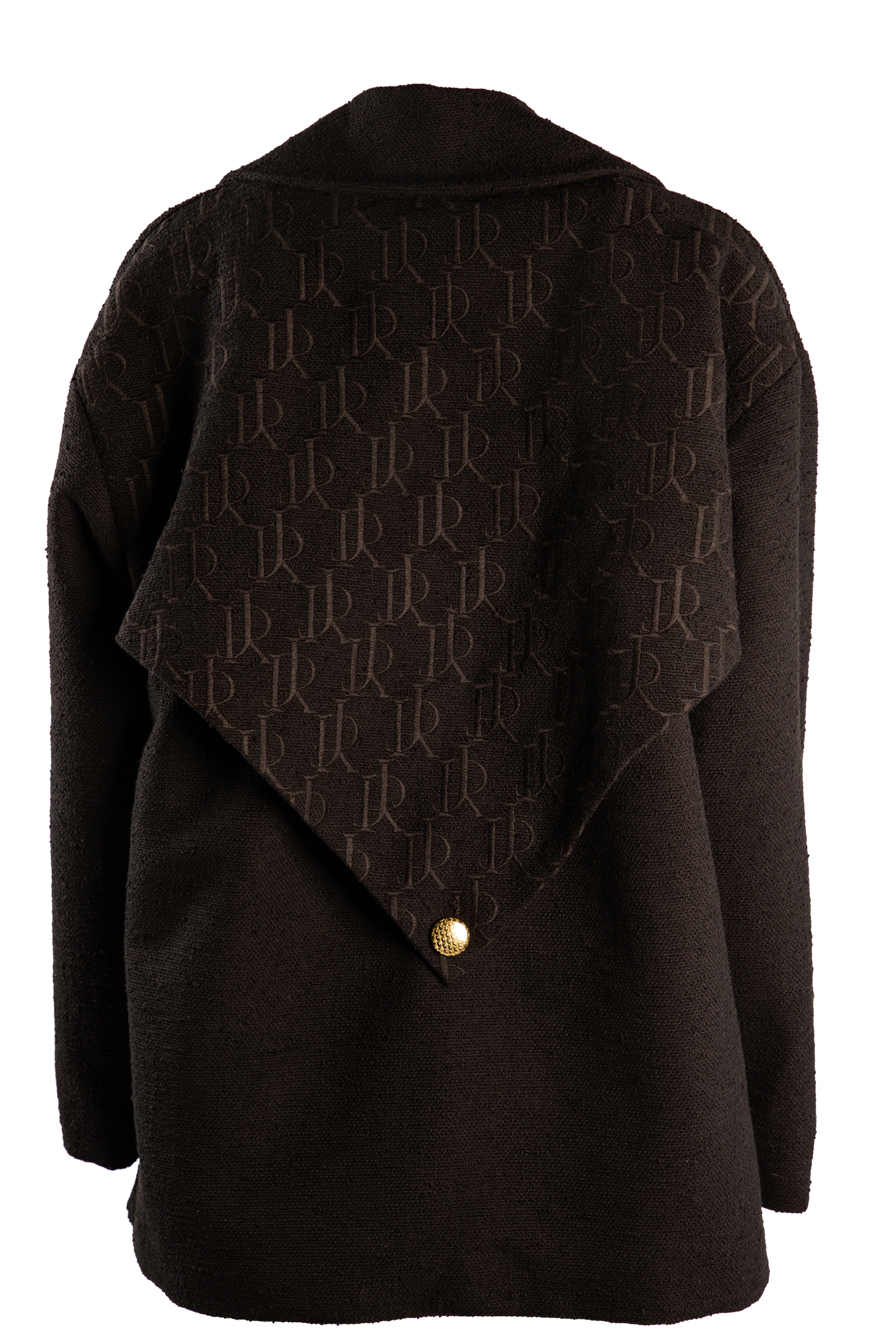 The Justin Rhys Backpack Coat mixes in convenience with luxury. Crafted out of a high end and heavy weight tweed self fabric with a beautiful silk lining, featuring Justin Rhys monogram button details on the sleeve, front backpack pocket, front pockets, and lastly a beautiful embroidered monogram JR logo on the back pack pocket flap. this garment is truly unique and one of a kind that is impossible to miss.
